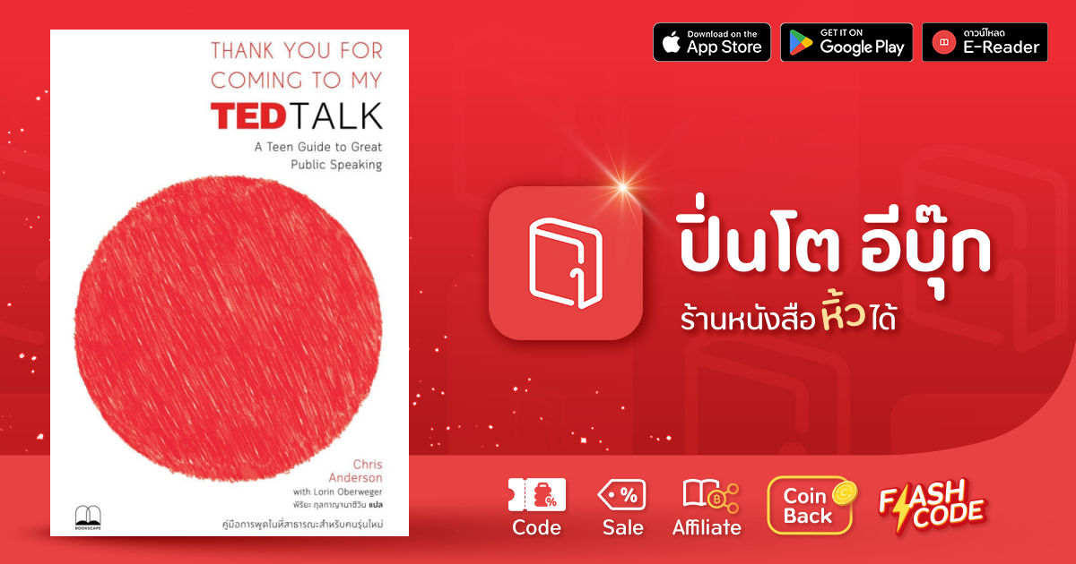 TED คือเวทีที่เชื่อในพลังการนำเสนอ “ความคิดที่ควรค่าแก่การเผยแพร่” คนรุ่นใหม่ต่างตบเท้าขึ้นเวที TED และ “พูด” เพื่อขับเคลื่อนโลกด้วยความคิดสร้างสรรค์อันน่าอัศจรรย์ คริส แอนเดอร์สัน ผู้อยู่เบื้องหลังความสำเร็จของ TED สกัดแก่นความรู้จากประสบการณ์ทั้งหมดลงในคู่มือการนำเสนอสำหรับคนรุ่นใหม่เล่มนี้ ตั้งแต่กลวิธีวางโครงร่างความคิด เทคนิคเสริมพลังการพูดด้วยเทคโนโลยี วิธีรับมือเมื่อต้องสื่อสารประเด็นหนัก ตลอดจนเคล็ดลับการเปิดตัวที่ “ฮุก” คนดูได้อยู่หมัด