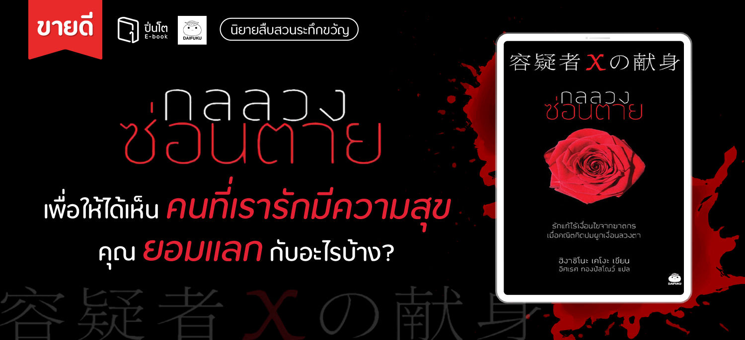 เรื่องราวของอัจฉริยะที่ใช้คณิตศาสตร์มาปกปิดการฆาตกรรมเพื่อความรักอันแสนบริสุทธิ์ ต้องมาปะทะกับอัจฉริยะฟิสิกส์อย่างกาลิเลโอ เรื่องราวสุดเข้มข้นจึงเกิดขึ้น “หากคุณไม่มีความสุข สิ่งที่ผมทำลงไปก็จะไม่เกิดประโยชน์อะไรเลย...” กลลวงซ่อนตาย 「容疑者Xの献身」เล่มที่ 3 ซีรีส์กาลิเลโอ การันตีคุณภาพด้วยรางวัล Naoki Award รางวัลสูงสุดของวงการวรรณกรรมญี่ปุ่น เป็นผลงานระดับตำนานที่ได้รับคำยกย่องมากที่สุดของ ฮิงาชิโนะ เคโงะ