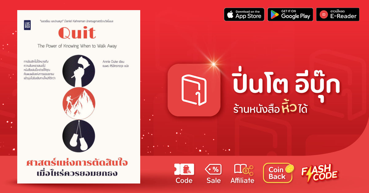 Quit ศาสตร์แห่งการตัดสินใจ เมื่อไหร่ควรยอมยกธง จะทำให้คุณบอกลาความคิดที่ว่าคนที่ล้มเลิกย่อมเป็นคนล้มเหลวไปได้เลย เพราะบางครั้งต่อให้ตั้งใจไปต่อมากแค่ไหนก็ไม่มีทางประสบความสำเร็จ และมันก็มีราคาที่ต้องจ่ายแพงเอาเรื่อง ทั้งเสียเวลา เปลืองพลังงาน และผลาญเงินทอง