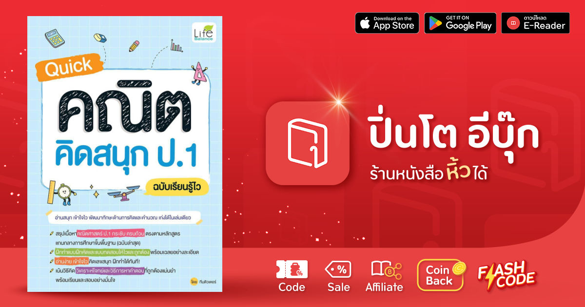 หนังสือ Quick คณิต คิดสนุก ป.1 ฉบับเรียนรู้ไว ได้รวบรวมเนื้อหาคณิตศาสตร์ ชั้นประถมศึกษาปีที่ 1 ไว้อย่างครบถ้วน กระชับ อ่านง่าย ตรงตามหลักสูตรแกนกลางการศึกษาขั้นพื้นฐาน (ฉบับล่าสุด) พร้อมแบบฝึกหัดและแบบทดสอบที่ออกแบบมาสำหรับนักเรียนชั้นประถมศึกษาปีที่ 1 โดยเฉพาะ เน้นวิธีคิด วิเคราะห์โจทย์และวิธีหาคำตอบที่ถูกต้องแม่นยำ ฝึกทำได้ทันที พร้อมเรียนและสอบอย่างมั่นใจ