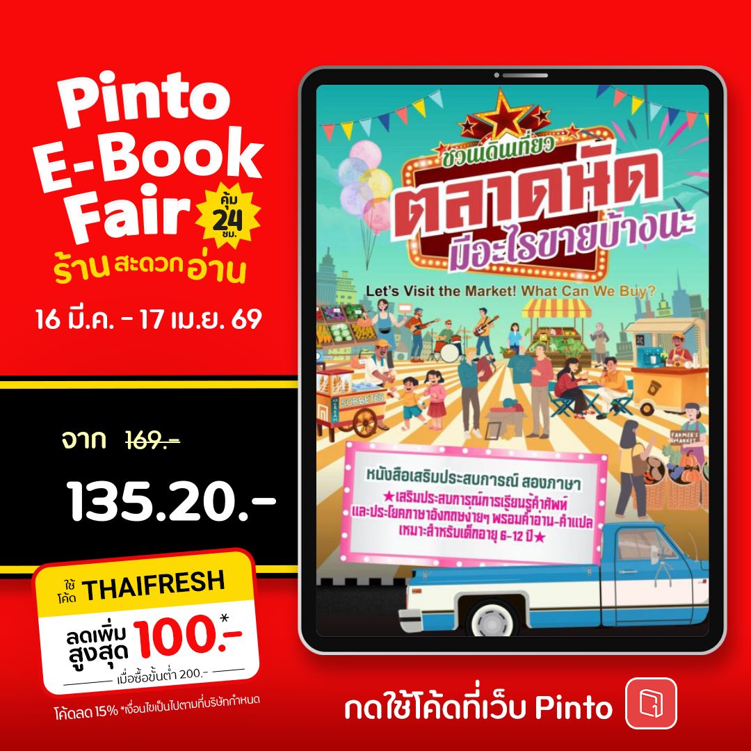 หนังสือเล่มนี้จะพาเด็ก ๆ เดินเที่ยวตลาดนัด พร้อมเรียนรู้คำศัพท์ภาษาอังกฤษง่าย ๆ จากสิ่งใกล้ตัว เพื่อให้การเรียนรู้เป็นเรื่องสนุกและเข้าใจง่าย