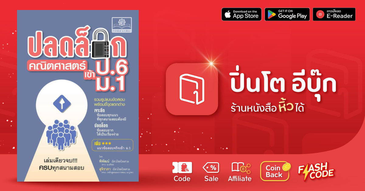 ปลดล็อกคณิตศาสตร์ ป.6 เข้า ม.1 (136 หน้า) จัดทำขึ้นเพื่อเสริมทักษะการทำข้อสอบให้กับนักเรียนระดับชั้น ป.6 ในหมวดวิชาคณิตศาสตร์ โดยผู้เขียนได้รวบรวมข้อสอบหลากหลายรูปแบบจากทุกสนามสอบ นำมาปลดล็อก สร้างความเข้าใจแบบง่าย ๆ และรวดเร็วด้วยการอธิบาย อย่างเป็นขั้นตอบ พร้อมทั้งชี้จุดแตกต่าง สร้างเทคนิคการคิดให้นักเรียนสามารถตีโจทย์แตกอย่างแม่นยำด้วย